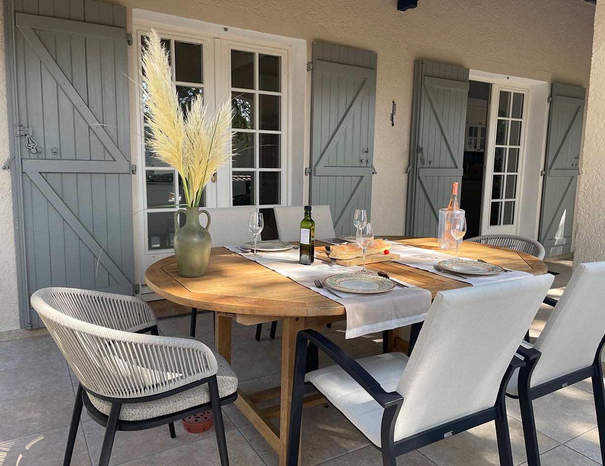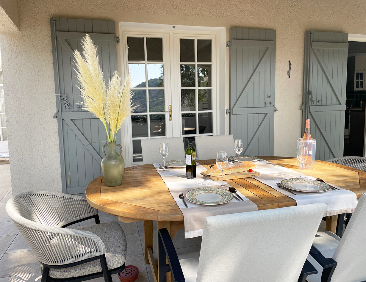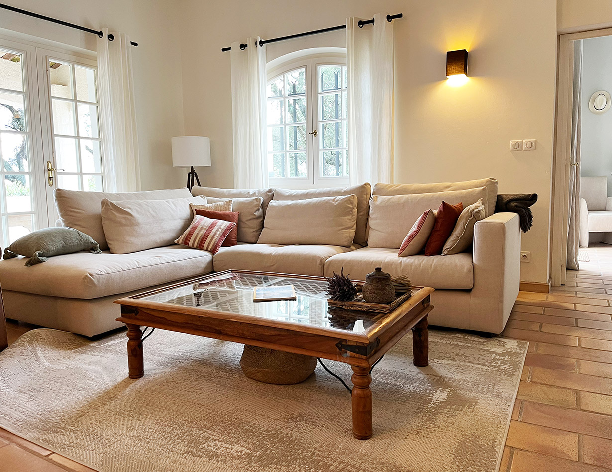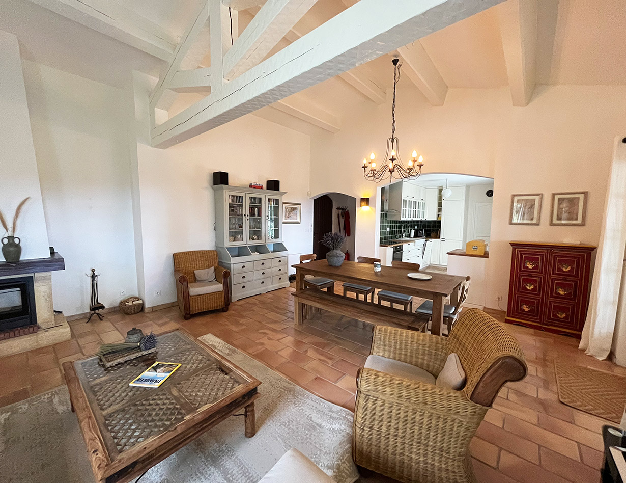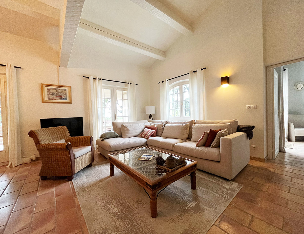 Das Innere der Villa ist im zeitgenössischen Design mit einigen „provenzalischen“ Akzenten, wie zum Beispiel tolle Balken, den Terrassentüren in allen Räumen und der überdachten Essterrasse mit großem Eßtisch – wunderbar im Sommer dort zu essen und den Blick zu genießen.