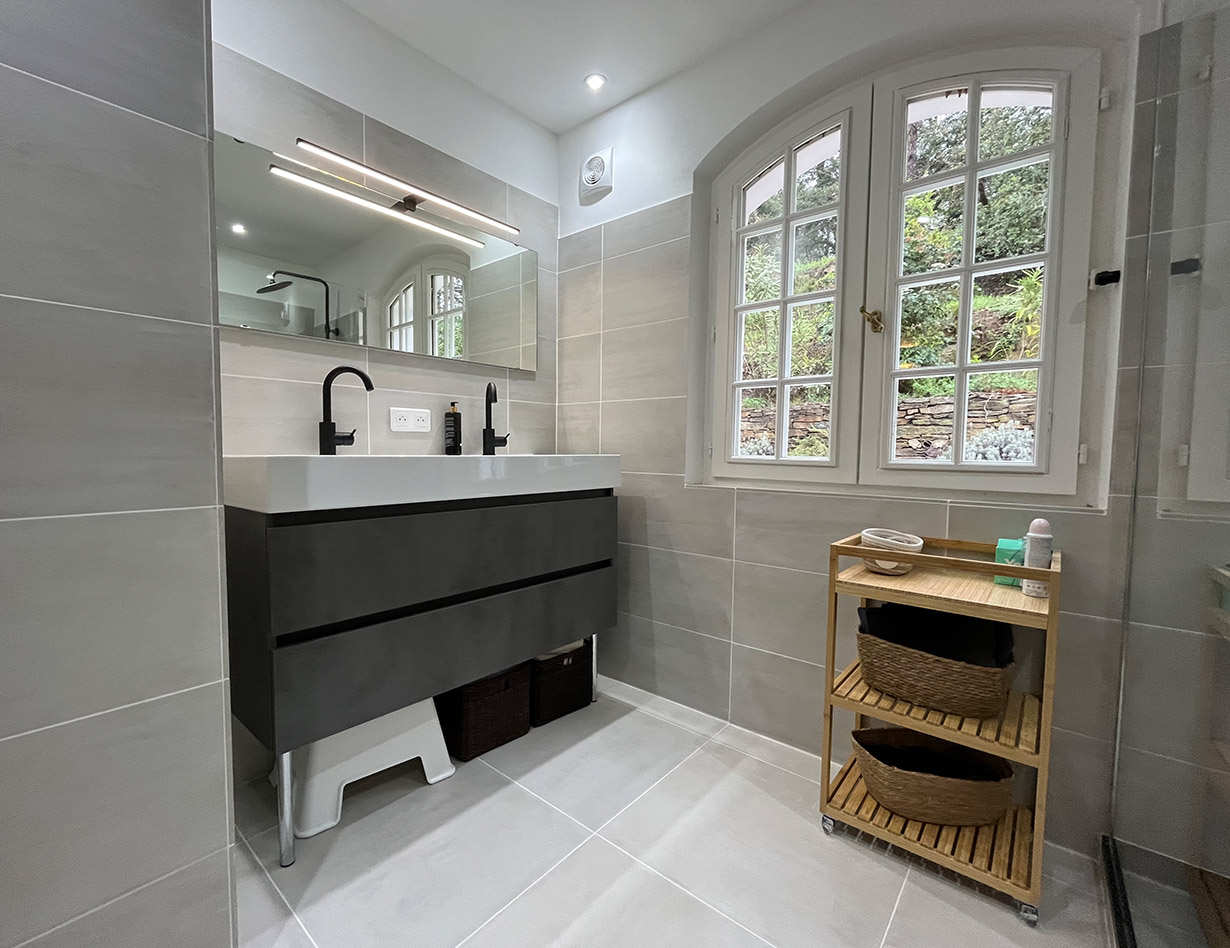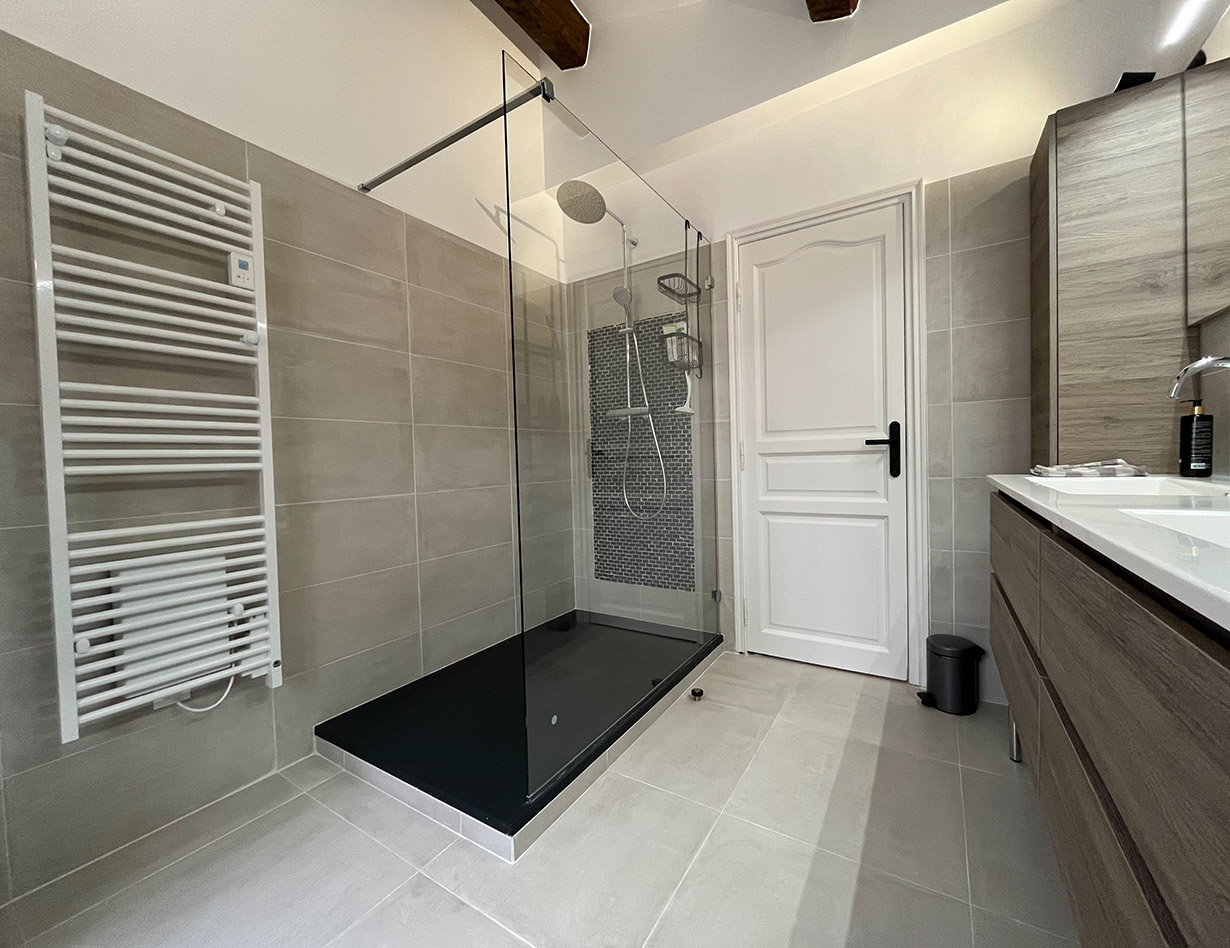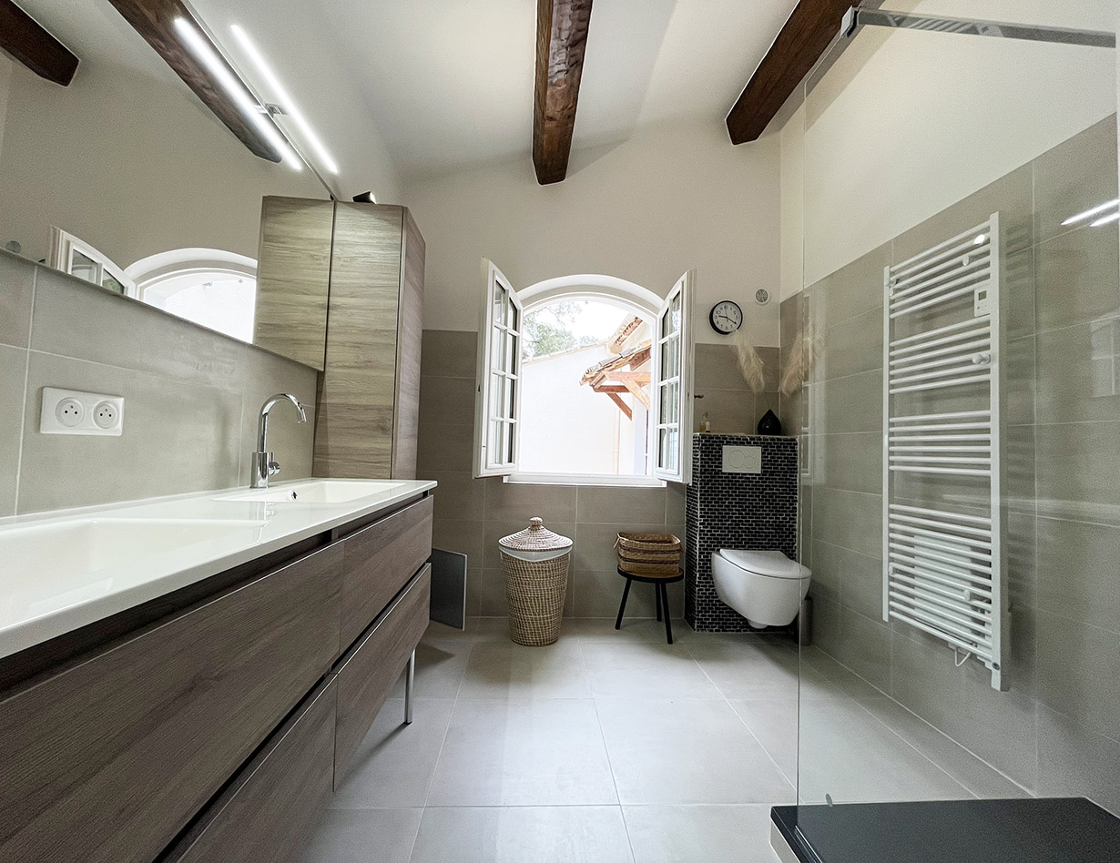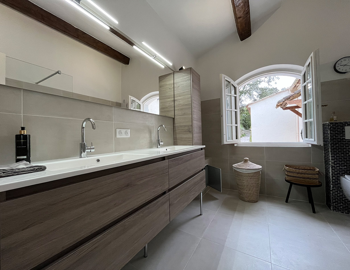 Das Innere der Villa ist im zeitgenössischen Design mit einigen „provenzalischen“ Akzenten, wie zum Beispiel tolle Balken, den Terrassentüren in allen Räumen und der überdachten Essterrasse mit großem Eßtisch – wunderbar im Sommer dort zu essen und den Blick zu genießen.