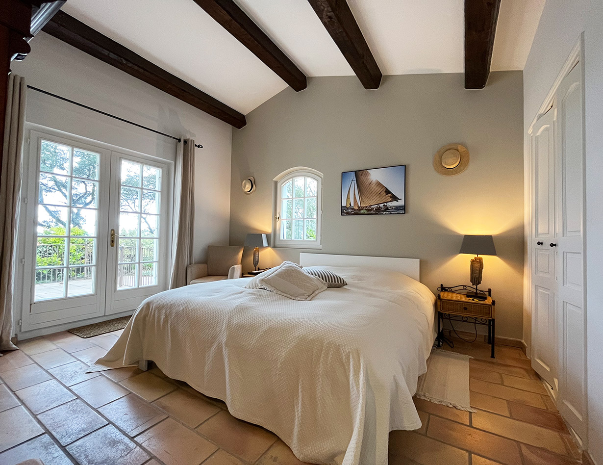 Dieses Schlafzimmer bietet einen schönen Blick über das Tal und verfügt über Terrassentüren, die einen direkten Zugang zum Pool ermöglichen.