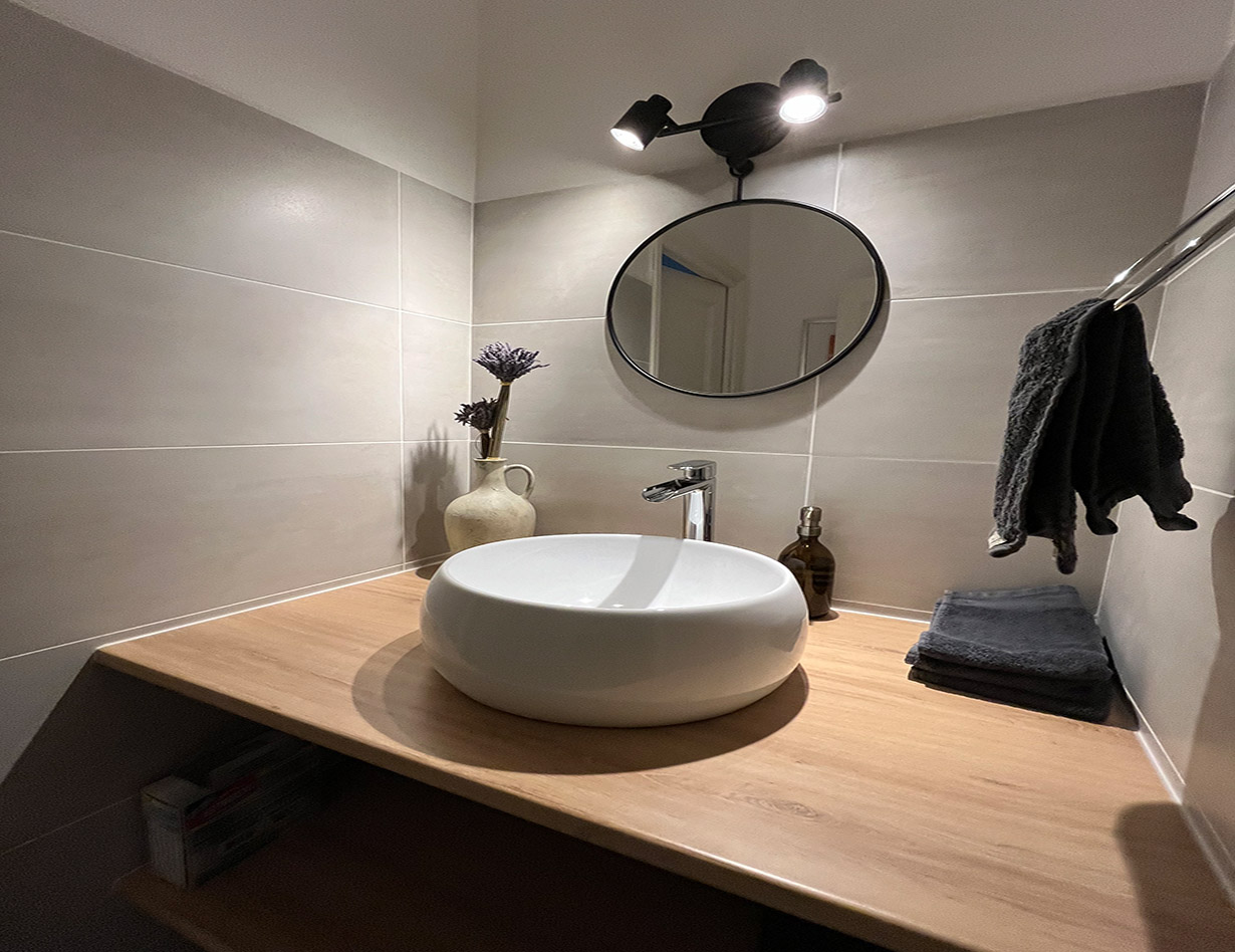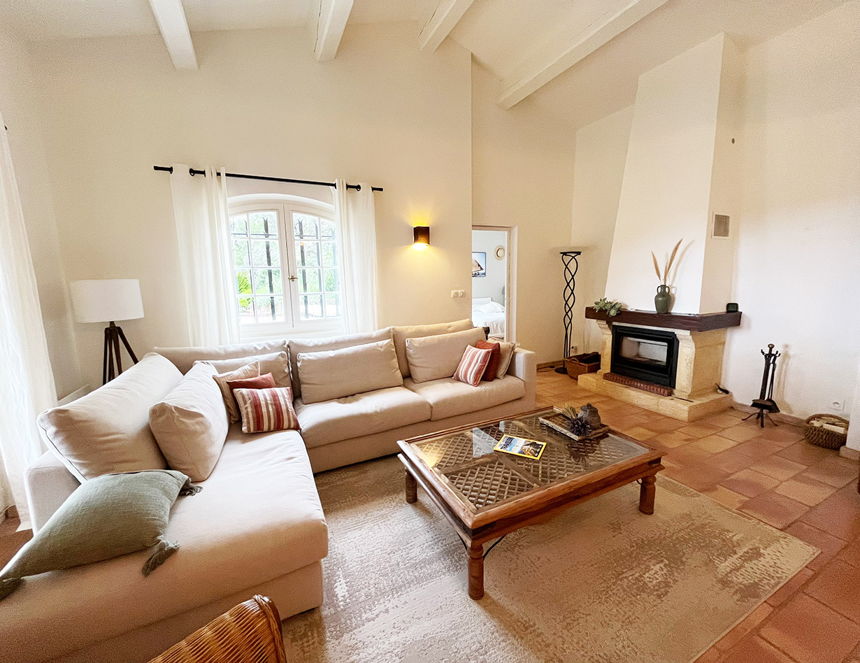 Der schöne provençalische Wohnbereich bietet eine gemütliche Sitzecke mit einem sehr bequemen Sofa, einem Kamin und einem Smart-TV, und natürlich WLAN.