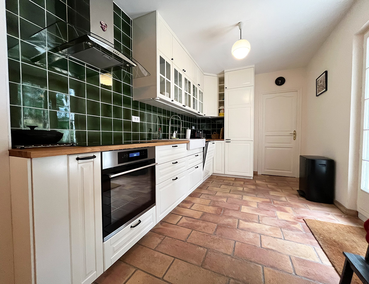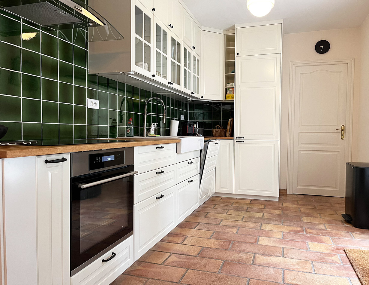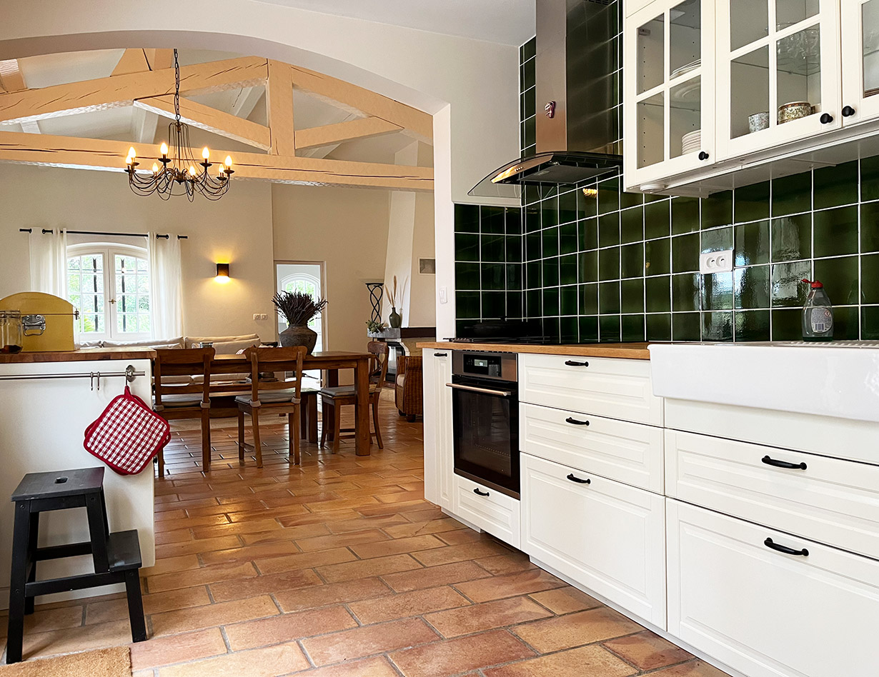 Darüber hinaus verfügt die Villa über eine sehr gut ausgestattete offene Küche, mit Geschirrspüler, Induktionsplatte mit Backofen, Wasserkocher, Nespresso-Kaffeemaschine sowie eine normale Kaffeemaschine und neben der Küche eine kleine